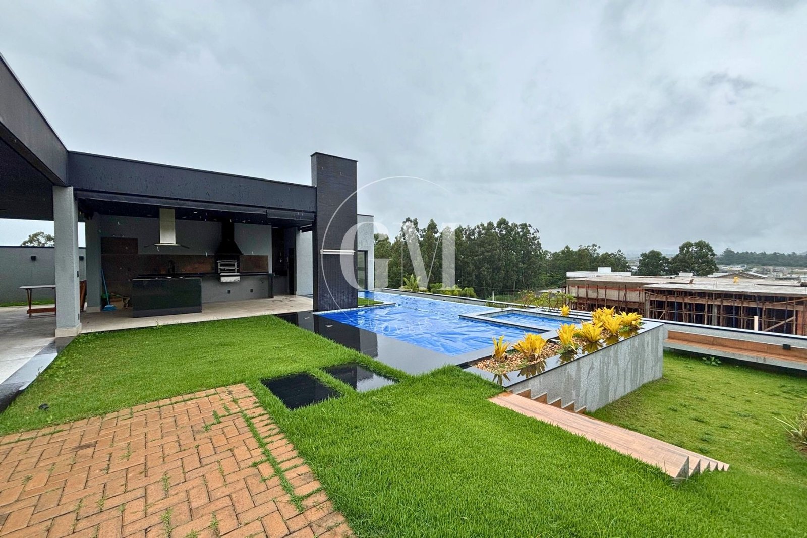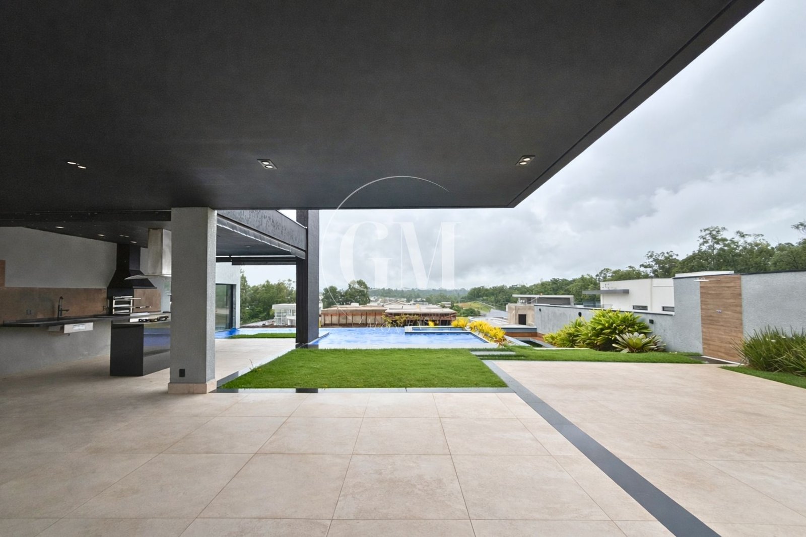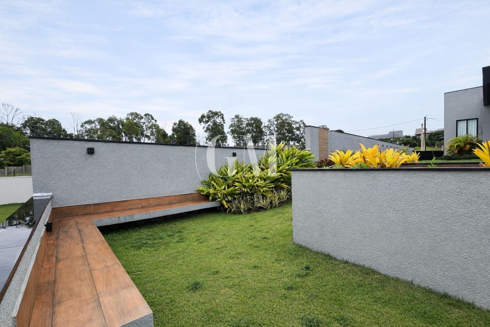 O jardim paisagístico completa o cenário, criando um ambiente agradável e harmonioso.